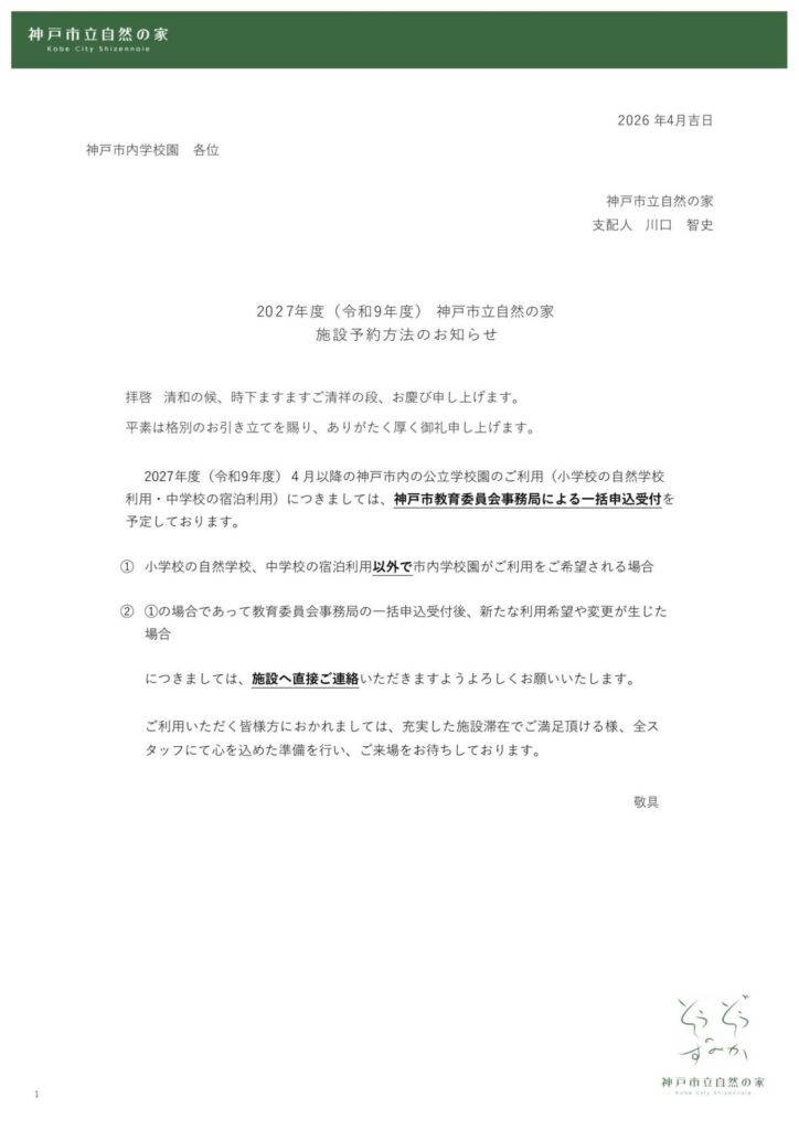 いつも神戸市立自然の家をご愛顧いただきまして誠にありがとうございます。